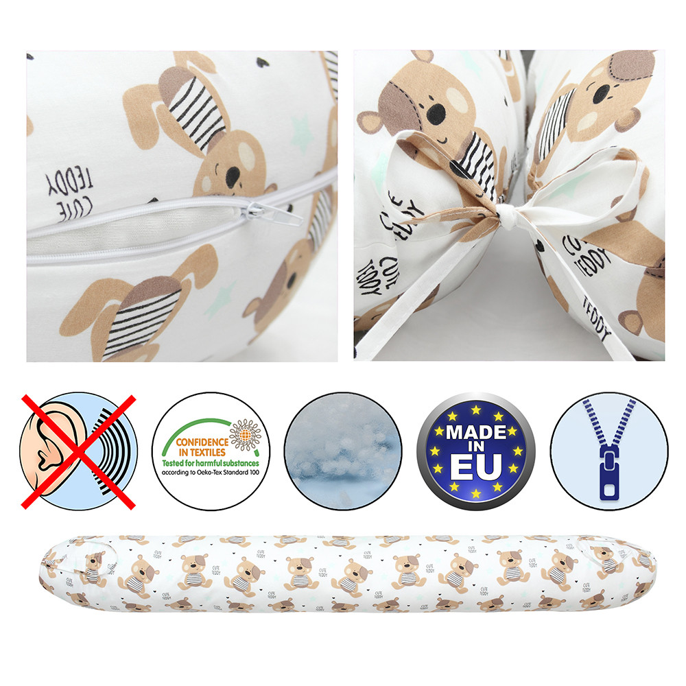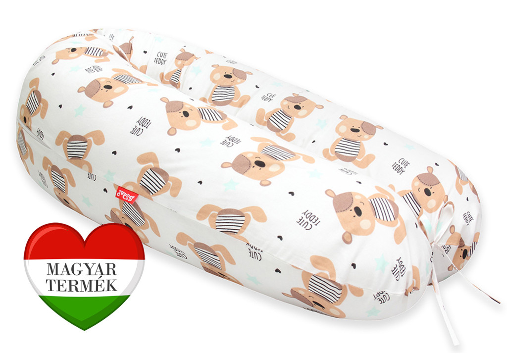 A terhesség a nő felejthetetlen, leggyönyörűbb élménye. Ennek ellenére azonban vannak olyan pillanatai, amiket mégis szívesen felejtenénk: a pocak növekedtével bekövetkező rossz testtartás okozta hátfájás, a kényelmetlen éjszakák, amikor azt sem tudjuk, merre forduljunk, hova helyezzük édes terhünket.Stella univerzális párna többfunkciós:1. Használható a terhesség alatt:- Segít a kényelmes testhelyzet felvételében.- Alátámasztja a hasat és a combokat.- mindeközben kényelmes, puha párnát biztosít a fejnek.- A megtámasztott fekvő testhelyzet komfortos a mamának, és a babának egyaránt.2. Használható szoptatáshoz:A szoptatás alatt nagyon fontos, hogy anya és gyermeke szoros testi kapcsolatban legyen. A gyermek egész teste érintkezzen édesanyja testével. Szoptatás alatt az anya testhelyzete egyenes, nem görnyedt, a baba fordul édesanyja felé, miközben egyik kezével átöleli őt. Nem az a anyának kell a gyermek fölé hajolni, hanem a babának kell a mellre fordulnia!Tehát első lépésként csavarjuk a párnát a derék köré, majd hátunk mögött kössük össze. Paskoljuk azt formára, majd vegyük kezünkbe a babát. 3. Használat bölcsőkéntKössük össze a párnát két végénél. Paskoljuk a megfelelő formára, majd a kialakított bölcsőbe fektessük bele a gyermeket.4. Használat támasztékként kiságyban, játék közben. Véd a kemény tárgyaktól, vagy a hideg falfelülettől.A párna külső huzataMéret: 150cm x 30cmA huzat leszedhető. Az évszaknak és az igényeknek megfelelően többféle kelméből készülhet. Két végébe zsinórt varrtunk, így a párna végeinél összeköthető.A párnaMérete: 160-155cm x 28cm- Csendes! Használat közben nem zsizseg, nem súrlódik a töltet.- Mosógépben mosható! Sőt! A mosások alkalmával a párna szinte felpuffad, felfrissül.
