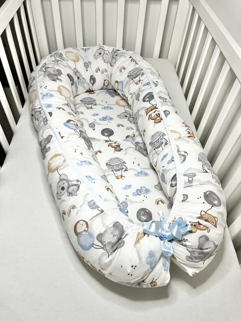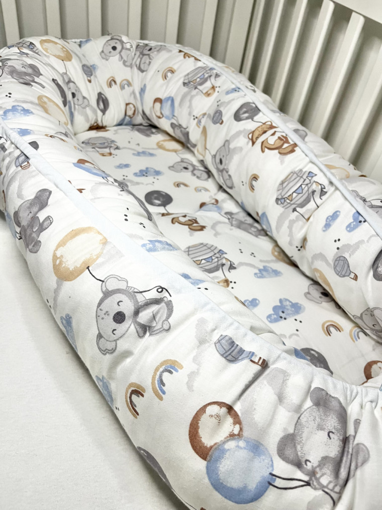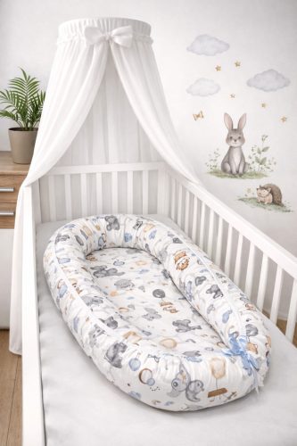 Mérete: – belső fekvő felülete 28cm széles 70 cm hosszúAnyaga: –belső huzat 100 % pamut, a külső puha minky anyag. -fekvőfelület töltete 2 cm vastagságú anti-allergén lapszivacs. – a fészek peremét I. osztályú anti-allergén golyós vattával töltjük.