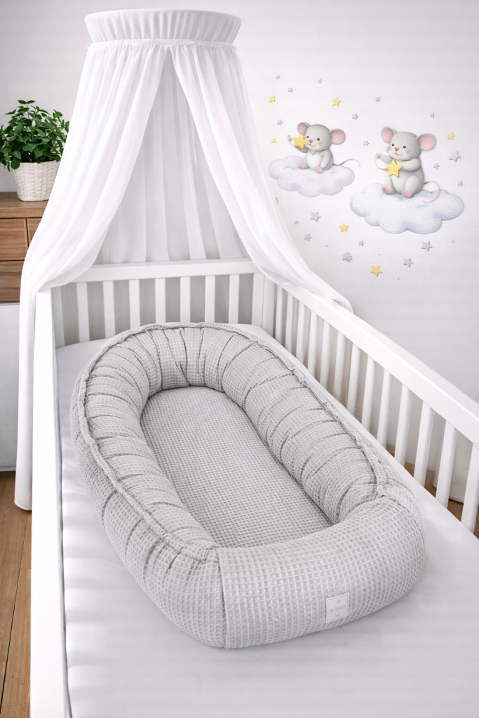 A szürke színvilág időtálló, uniszex és bármely babaszobába harmonikusan illeszkedik – legyen szó modern, skandináv vagy épp klasszikus hangulatról. A fészek körkörös pereme védelmet nyújt az akaratlan mozdulatok ellen, így segíti a baba nyugodt alvását.