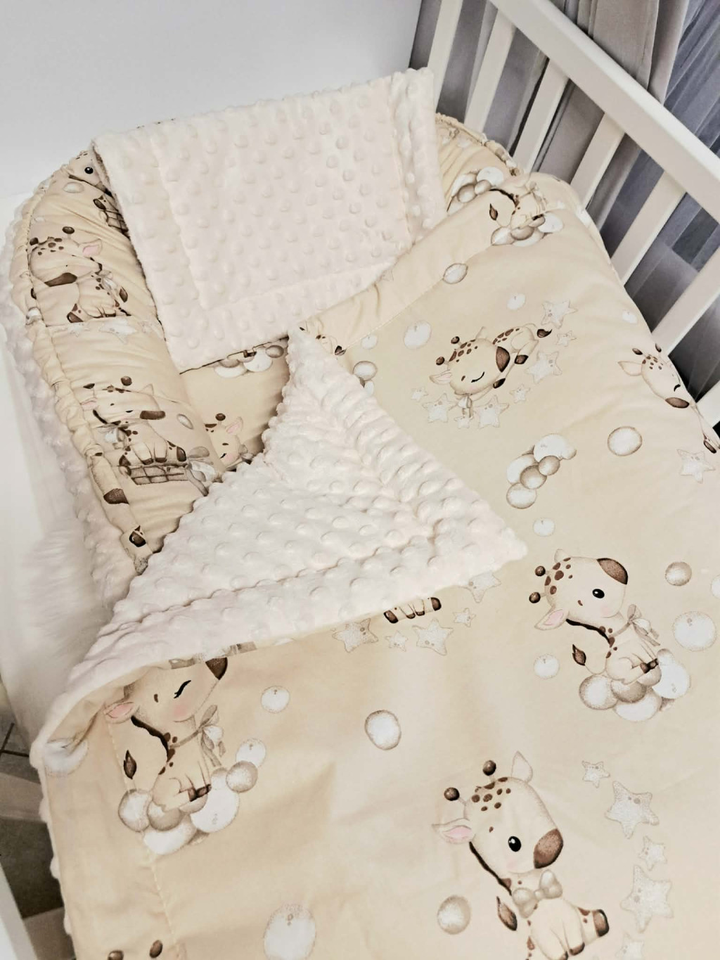 A párna és a takaró is kétoldalas - egyik oldalon puha Minky anyag, a másikon pamut többféle mintázattal.