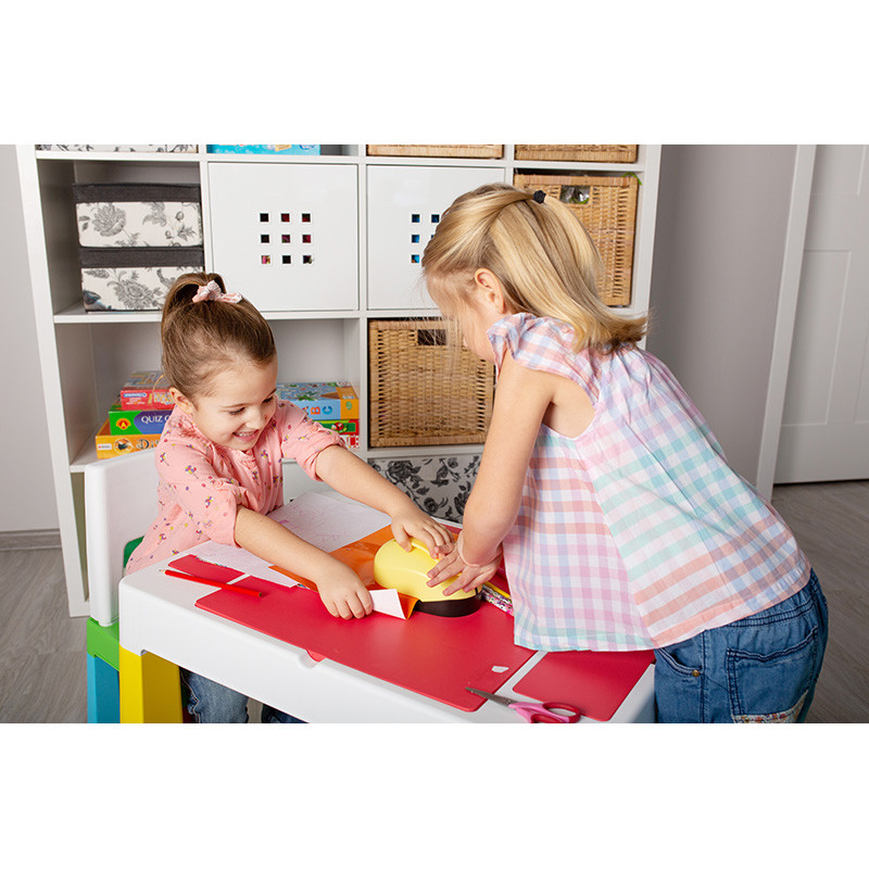 A készlet egy masszív, mégis könnyen mozgatható asztalt és hozzá illő, kényelmes széket tartalmaz. Az asztallap kettős funkciójú: az egyik oldala sima, ideális a rajzoláshoz, festéshez vagy íráshoz; a másik oldala texturált, így kompatibilis a legismertebb LEGO DUPLO építőkocka márkával (a kockák nem tartozékok), így az építkezés is garantált élmény lesz.